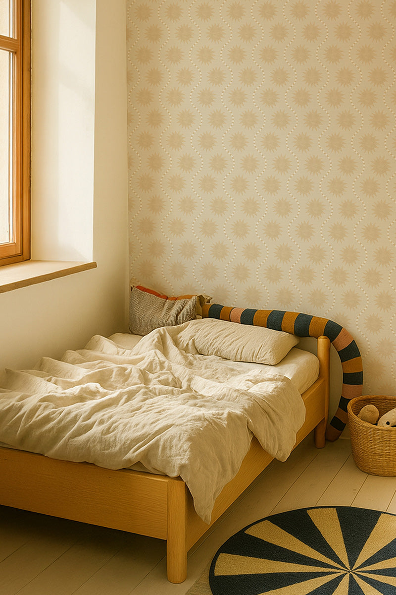 Behang Bora in een mooi beige basis tint met sterren tussen een golvende gestreepte lijn op een zachte beige achtergrond met een ecru lijn structuur. Mooie rustige basis voor elke kinderkamer.