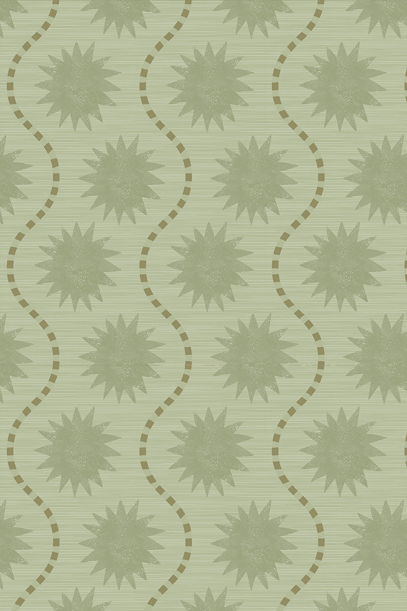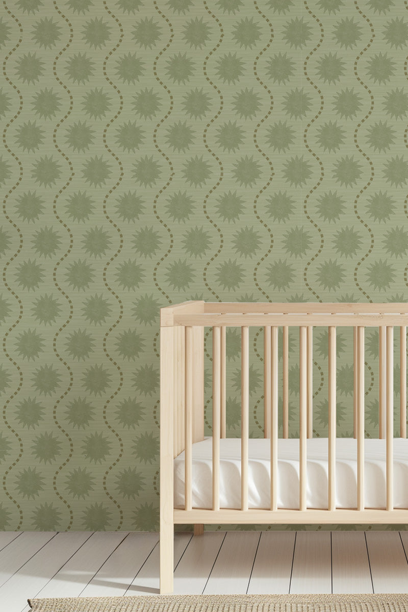 Behang Bora in een mooi groene tone in tone tint met sterren tussen een golvende gestreepte lijn en een zachte structuur streep op de achtergrond. Mooie rustige basis voor elke kinderkamer. Combineerd mooi met blauw en groentinten en ook super leuk om ook cognac en bordeaux eraan toe te voegen.