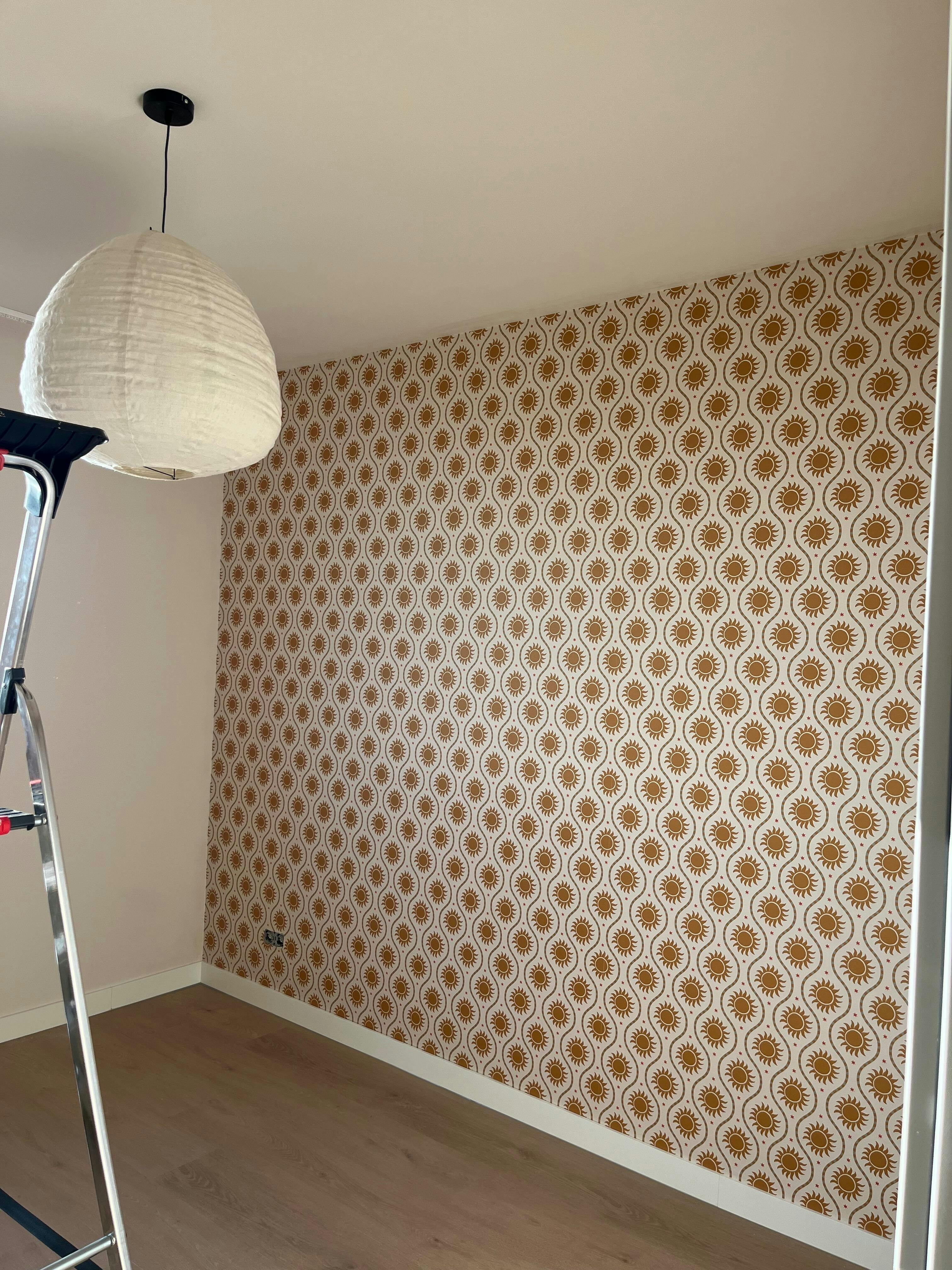 Haal het zonnetje in huis met het behang Sol Cream uit de eigen lijn van Luz and Moon. Deze exclusieve print met de caramel gele zonnetjes die tussen de golvende gestreepte lijnen staan is er 1 waar iedereen vrolijk van wordt. In de golvende lijn een mooi groen kleuraccent en de oranje rode sterretjes die geven het behang net wat extra's. Leuk om dit behang te combineren met een stoere streep of met de Sol items uit de textiel collectie.
