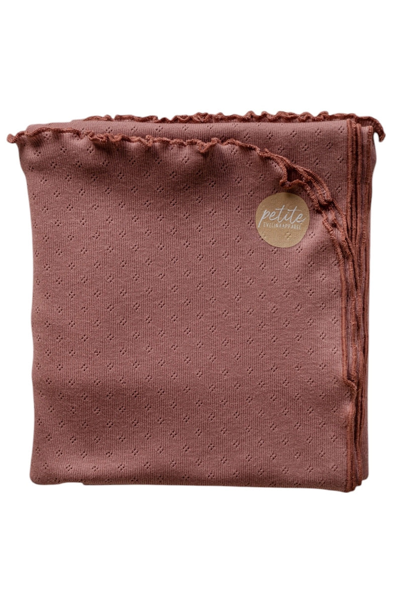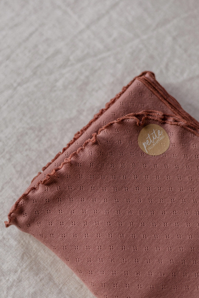 Dit fijne en luchtige katoenen dekentje is multi inzetbaar en heeft een prachtige kleur Clay. Gebruik deze deken als swaddle, inbakerdoek, lakentje of dekentje. Gemaakt van 100% organic katoen met een subtiel pointelle dessin en een mooi sierrandje. Dit dekentje voelt heerlijk zacht aan de huid van je baby. Het ajour effect in de zachte tricot is een mooie basic. In de zomer kan je deze swaddle gebruiken als dekentje en wanneer het weer wat kouder word als lakentje met een fijn babydekentje er overheen.